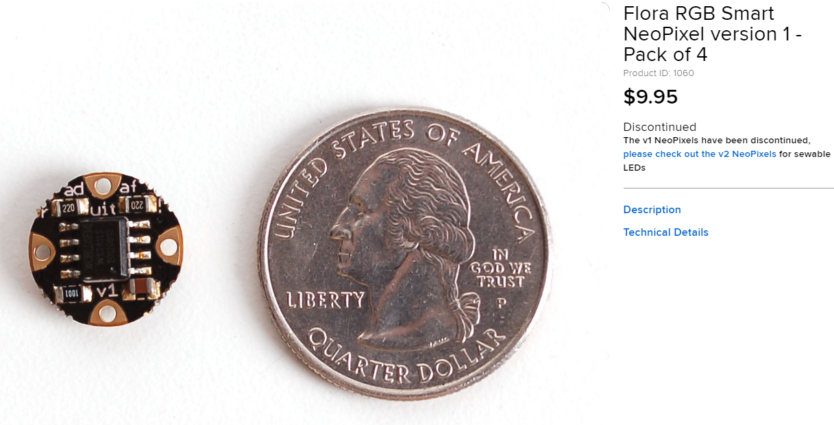 Adafruit 사의 네오픽셀(Neopixel)은 컬러 LED와 제어칩을 하나의 모듈로 만든 태로 1개의 신호만으로 밝기와 색상을 바꿀 수 있으며, 이론상 무한대의 네오픽셀 연결해 움직이는 무지개, 사운드