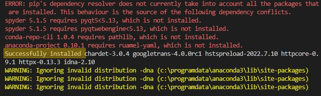 여기서도 에러가 발생하였지만, 번역을 하는 데에는 문제가 없습니다. Successfully installed 문구로 라이브러리가 성공적으로 설치되었음을 확인할 수 있습니다.