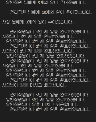 결과를 살펴보면, 사장이 퇴근(Main 종료)을 했음에도 직원들은 남아서 일을 합니다. 일반직원의 야근이 끝나면 관리직원은 본인의 일이 아직 끝나지 않았음에도 강제퇴근을 합니다.
